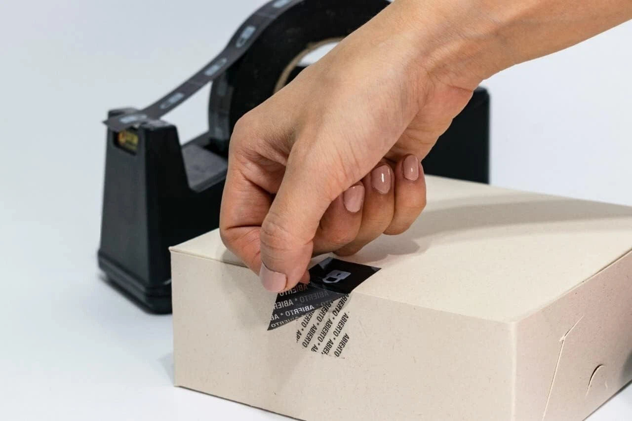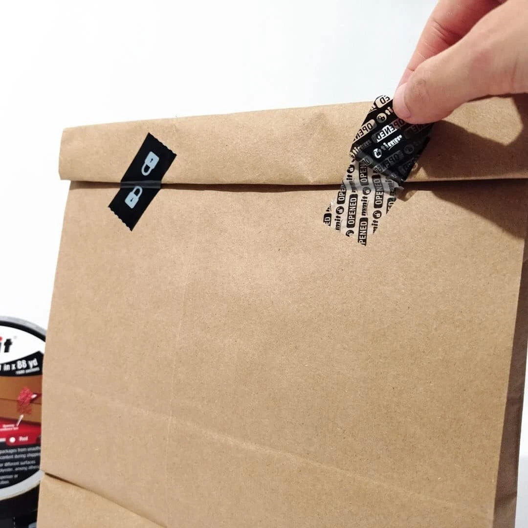 RECOMMENDATIONS FOR THE APPLICATION: Place the tamper seal at critical opening points. Do not roll the tape on itself. The tape should go around the bag and join the ends of the tape. The surface must be clean before sticking the tape. Place the tape in the package to be sealed, exerting pressure on the tape to ensure adherence. Tamper proof stickers increases adhesion over time.